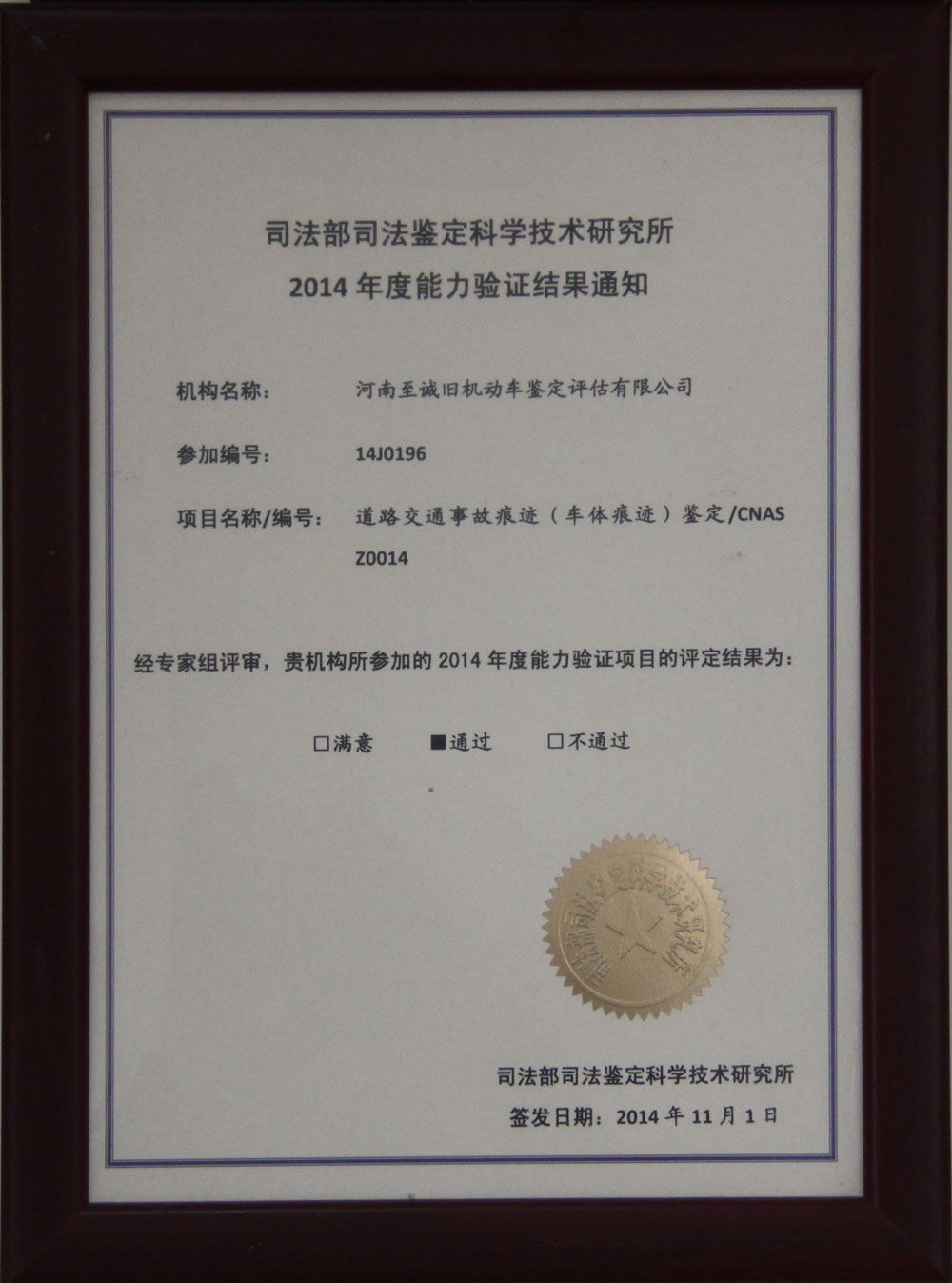 2014年度能力验证结果通知:道路交通事故(车体痕迹)