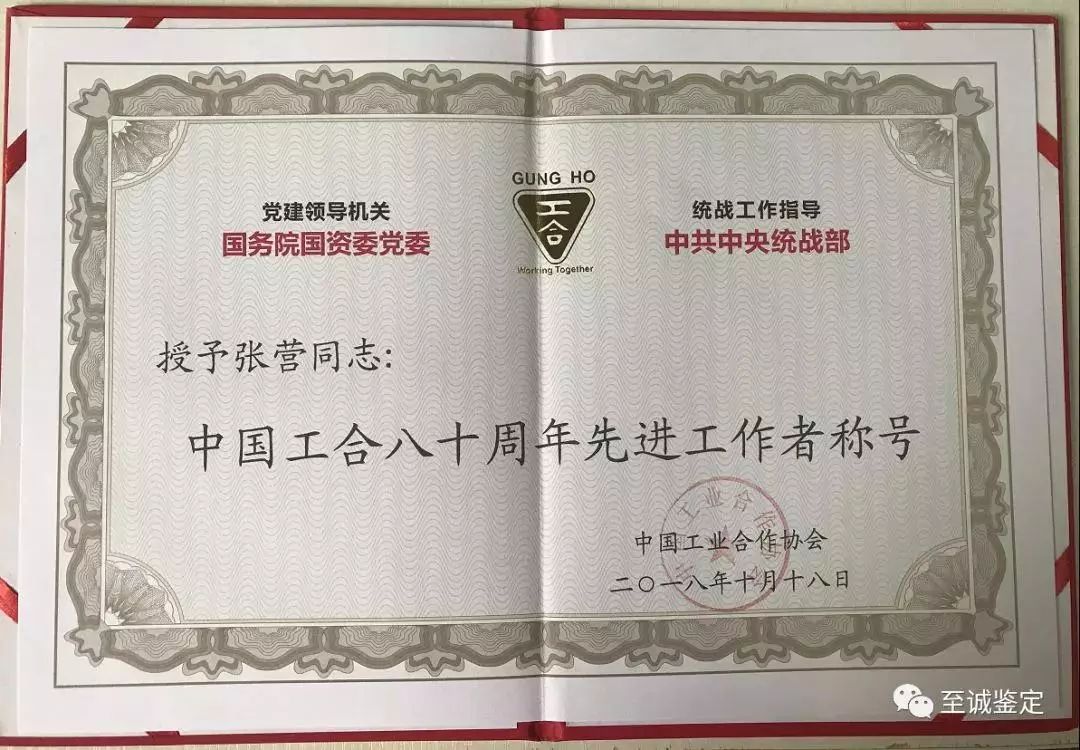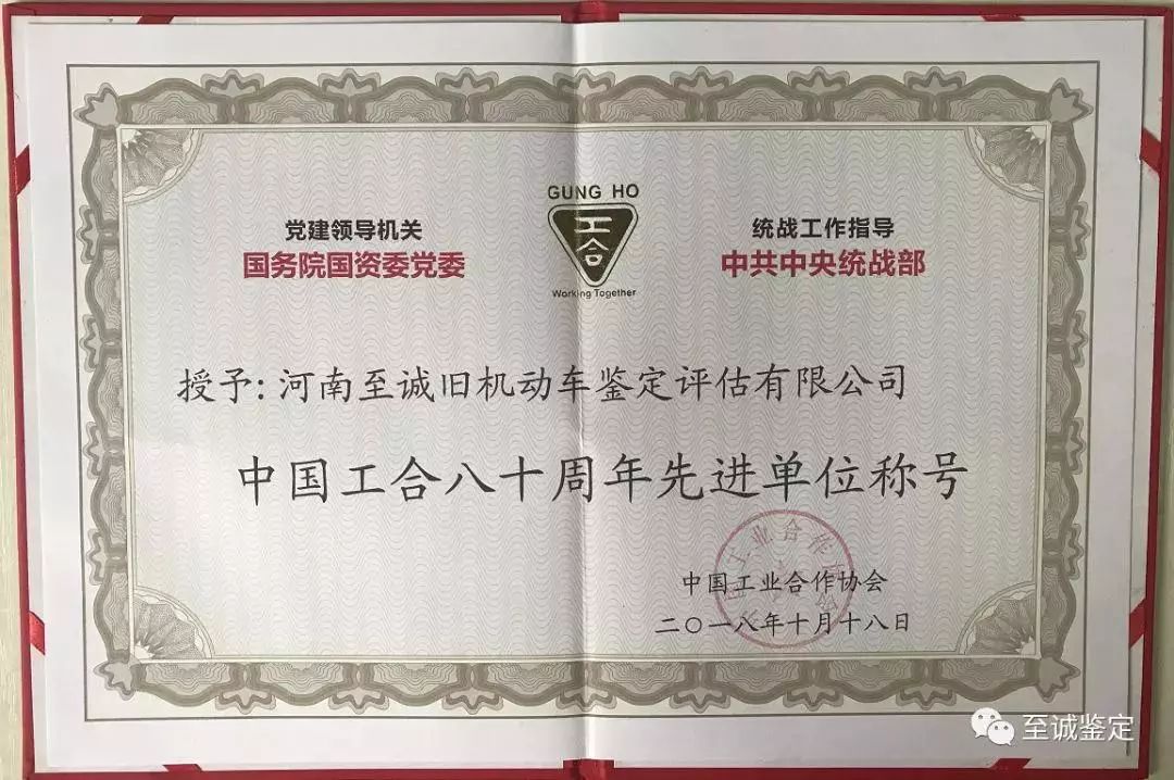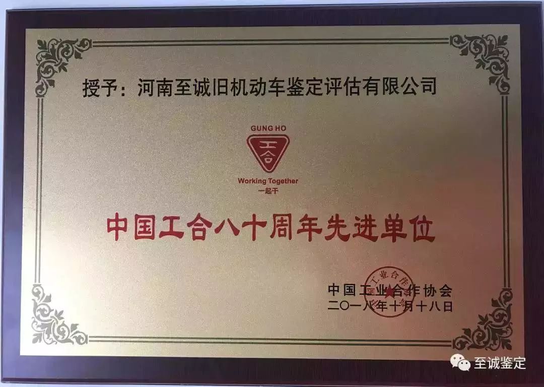 10月18日中国工业合作协会第五次全国会员代表大会,对工合系统的先进集体和先进个人进行表彰。授予:河南至诚旧机动车鉴定评估有限公司“中国工合八十周年先进单位”、张营同志“中国工合八十周年先进工作者”.