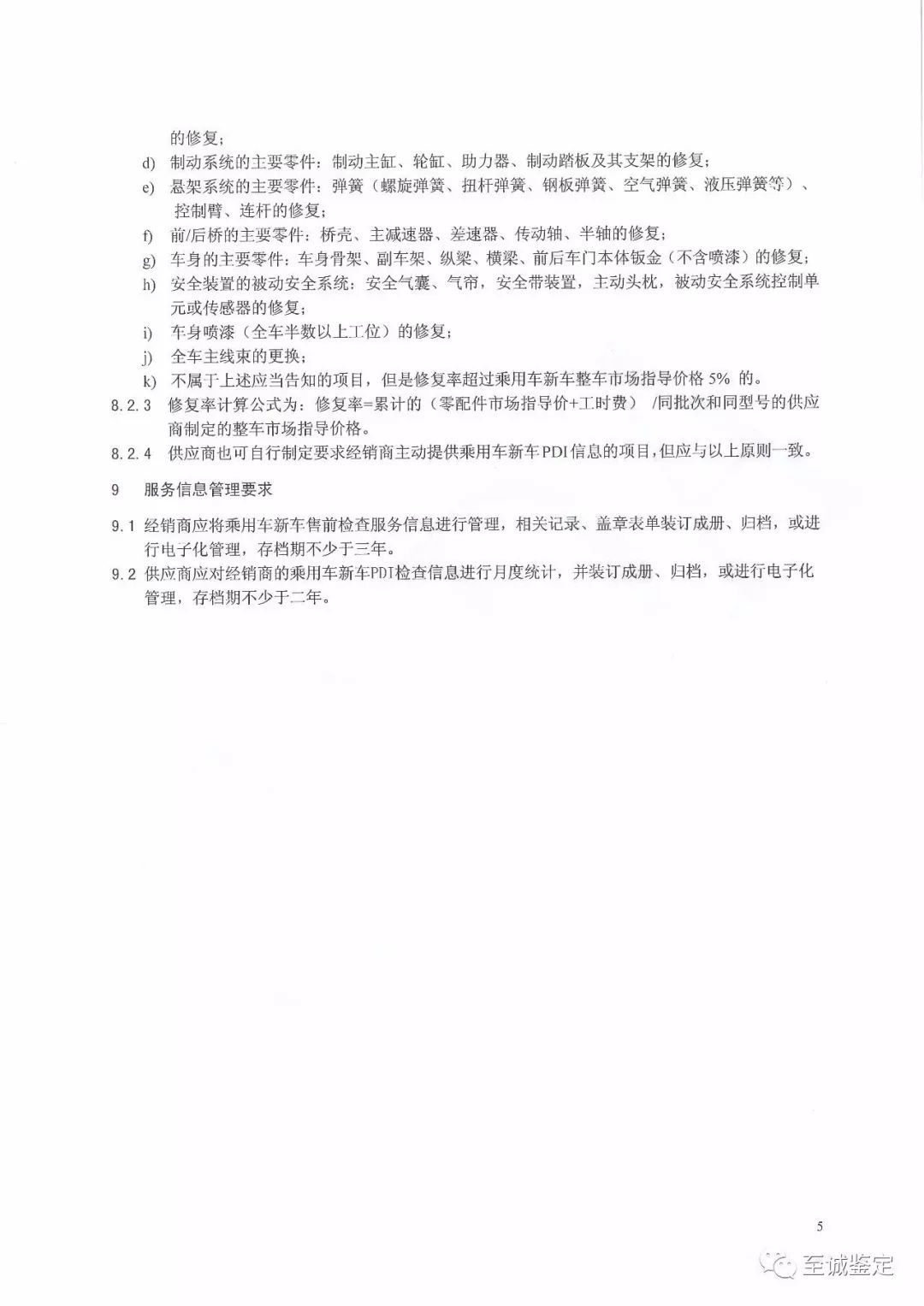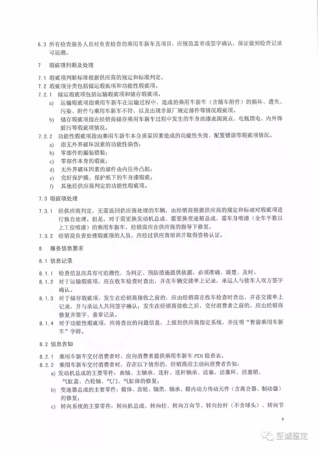 《指引》就范围、指引引用文件、术语缩略语和定义、服务项目、服务场所及设备要求、服务人员要求、瑕疵项判断及处理要求、服务信息要求以及服务信息管理要求等进行了明确规范,其中重点阐述了信息记录、信息告知的相关条款,对运输、存储、功能性瑕疵,全车主要零部件及修复率计算等作出了系统性描述。