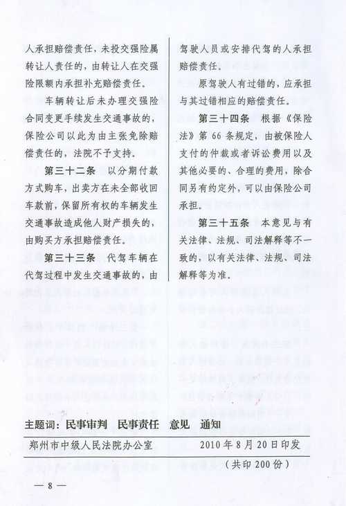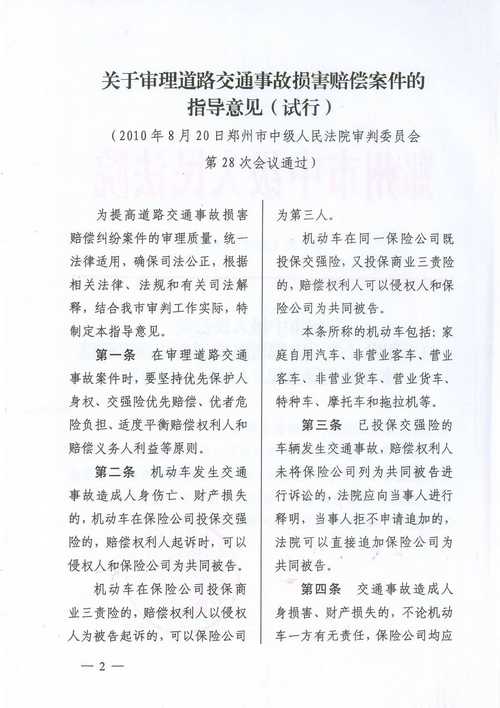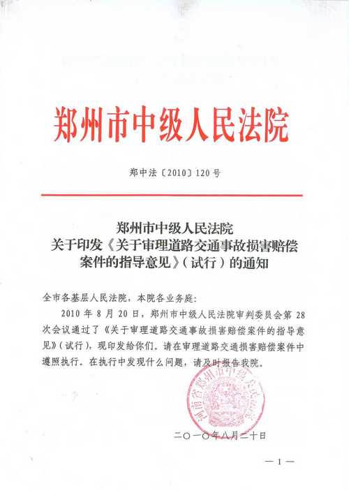郑州市中级人民法院120号文《关于审理道路交通事故损害赔偿案件的指导意见》